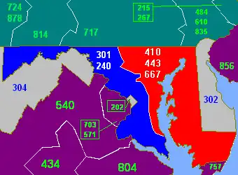The blue area is assigned area codes 301, 240, and 227; the red area is area codes 410, 443 and 667