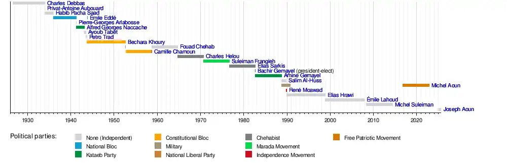 Joseph AounMichel SuleimanÉmile LahoudElias HrawiRené MoawadMichel AounSalim Al-HussAmine GemayelBachir GemayelÉlias SarkisSuleiman FrangiehCharles HelouCamille ChamounFouad ChehabBechara El KhouryPetro TradAyoub TabetAlfred NaccachePierre-Georges ArlabosseÉmile EddéHabib Pacha SaadPrivat-Antoine AubouardCharles Debbas
