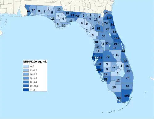 There are more than 1,900 properties and districts listed on the National Register of Historic Places in Florida. They are distributed through 66 of the state's 67 counties. Of these, 42 are National Historic Landmarks.