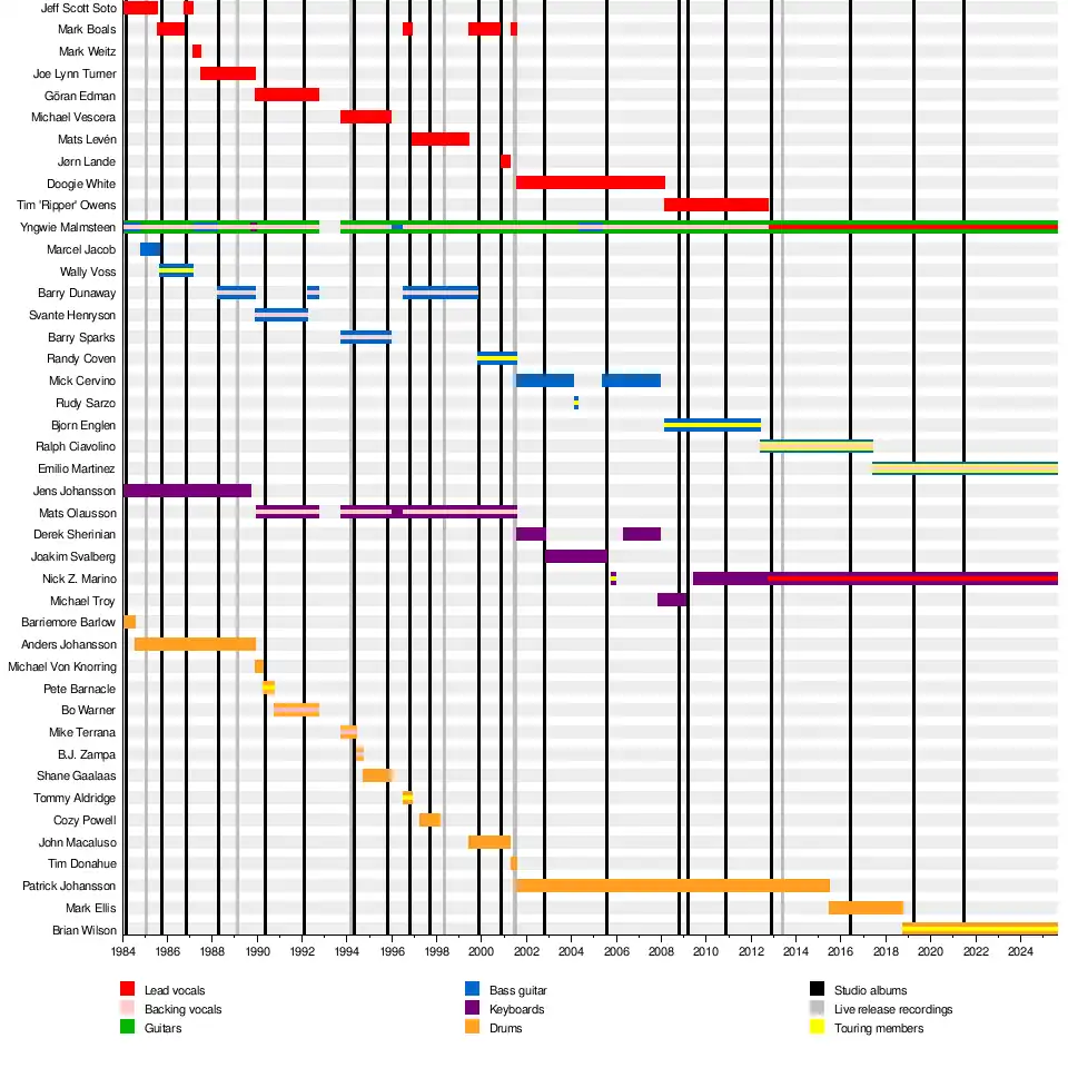 Yngwie Malmsteen is a Swedish neoclassical metal musician. After tenures in the bands Steeler and Alcatrazz, he started his solo career in 1984 with the release of Rising Force, which was the name of his first band in 1978 featuring bassist Marcel Jacob and drummer Zepp Urgard. The original 1984 lineup of Malmsteen's band included vocalist Jeff Scott Soto, former Jethro Tull drummer Barriemore Barlow and keyboardist Jens Johansson, with Jacob added as the first touring bassist. The current lineup includes keyboardist Nick Marino (since 2011), bassist Emilio Martinez (since 2017) and drummer Wyatt Cooper (since 2024). Marino (live) and Malmsteen (studio) perform lead vocals.