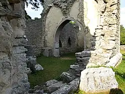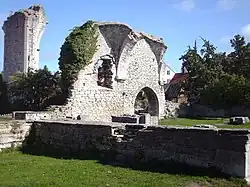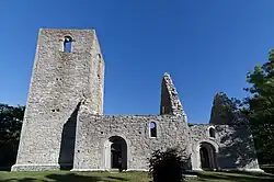 The churches of Saint Peter and Saint Hans (the latter may refer to either John the Baptist or John the Evangelist) are joined together and form a single complex. The church dedicated to Saint Peter is the older, probably from the middle of the 12th century. It was successively rebuilt and enlarged. The history of Saint Hans is opaque, but it was built as a basilica. During excavations, two runestones and a picture stone have been found among the ruins, pointing to a possibly even older, pagan sacred site. Both churches have in later centuries been used as quarries for limestone.[8][12] | |