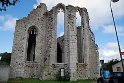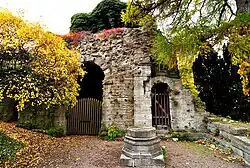 The church was dedicated to Saint George and lies about 300 metres (980 ft) outside the city walls. It was originally tied to an almshouse for lepers nearby. The church is lacking in decorative elements and has therefore been difficult to date.[8] The choir and nave probably date from different periods. The choir is the oldest, perhaps from the late 12th or early 13th century, and the nave may date from the 13th century.[11] The almshouse was shut down in 1542,[8] but the cemetery continued to be used occasionally, e.g. during an outbreak of plague in 1711–12 and following an outbreak of cholera in the 1850s.[11] |