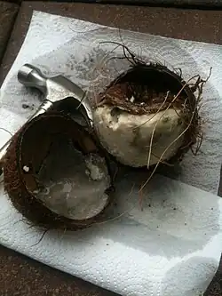 Coconut gone bad: the dark spots are very bitter and the whole meat has turned yellow. The first indication is a bitter taste of the water; this coconut should not be consumed.