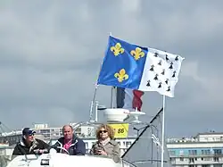 Saint-Malo's current flag is a blue flag with a white cross (the emblem of war ports under Louis XIV) and a gules franc quartier charged with a white ermine on a gold portcullis. Known as the "corsair flag", this is the flag of ships registered at the Saint-Malo Admiralty (and not the flag of Malouin privateers).[6] In existence since the 18th century, privateers were only required to fly the following flags in the event of an attack: King's flag under the Ancien Régime, or the national tricolor flag from the Revolution onwards.