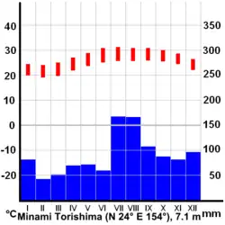 In contrast, Minami-Tori-shima has the highest annual average temperature in Japan. This is a small island in the Pacific Ocean, some 1850 km from Honshu. It has an annual average temperature of 25.8 °C (78.4 °F), exceeding the value recorded by all weather stations including Okinawa Prefecture. And the extreme minimum temperature in the region is 13.8 °C (56.8 °F), which is unique in the whole of Japan, because even in Okinawa Prefecture, the minimum temperature of the year tends to be lower than 10 °C (50 °F).