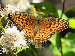 This is a list of species of butterfly with the common name fritillary. The term fritillary refers to the chequered markings on the wings, usually black on orange, and derives from the Latin fritillus, meaning "dice-box" (or, according to some sources, a "chequerboard"); the fritillary flower, with its chequered markings, has the same derivation.[1] Most butterfly fritillaries belong to the family of Nymphalidae, within which are several genera whose species are nearly all called fritillaries: Argynnis, Boloria, Speyeria (the greater fritillaries), Euphydryas, Melitaea, and Agraulis.