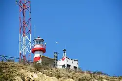 79 24 27 | White round metal tower, red band; | 13. | Visible 042°-255°. 3 F.R. on radio mast 1.97 miles SSE. F.R. on radio mast 0.73 mile S. Siren: 1 bl. ev. 30s (bl. 3s, si. 27s). |
