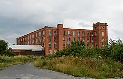 Western No 1 is an integrated mill with a spinning block with integral engine house, chimney, reeling and winding rooms, weaving shed and warehouse. It is dated 1884 on the parapet above the entrance bay. The spinning block is built in red brick with a plinth of blue engineering brick and sandstone dressings. It is a Grade II listed building.[71] Possibly already demolished. Western No 2, dated 1888 is an integrated mill comprising a spinning block with boiler house, engine house and chimney, winding and beaming rooms. Its weaving shed has been demolished. The four-storey spinning block is built of common brick with sandstone dressings and has a concealed roof. Its two-storey winding and beaming rooms have a deep basement. Its chimney has a plinth of blue engineering brick and tapered octagonal shaft. It is a Grade II listed building.[72] Western No 3 Mill, dated 1900, is a spinning mill with a boiler house, chimney and engine house, and a beaming and reeling block. The mill is used as a warehouse. The four-storey mill is built of common brick with sandstone dressings and has a concealed roof. It has a square tower rising above the parapet.[73] Altogether Eckersley's mills housed 236,572 ring spindles, 14,554 mule spindles and 1687 looms.[68] |