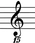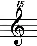 Octave clef Treble and bass clefs can be modified by octave numbers. An "8" below the clef (as in the third diagram) indicates that pitches will sound an octave lower than they would with the unmodified clef. A "15" below indicates a two-octave shift. These numbers may also be used above the clef to indicate pitches one or two octaves higher. A treble clef with an eight below is the most common version, typically used in music for guitar or tenor voice. Sometimes a shift of one octave up is indicated by drawing two clefs instead of one. |