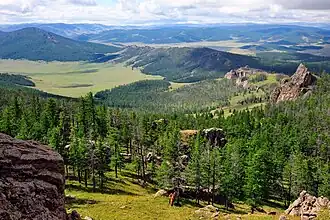 6576 | 2000 | The park covers the southwestern sector of the Tarvagatai Range of the Khangai Mountains in central Mongolia. The park is remote, protecting a transition zone between semi-arid steppe to the south and coniferous forests on the northern slope of the range. A large fire burned a significant part of the park in 2002, including 800 square kilometres (310 sq mi) of forest.[9] | |