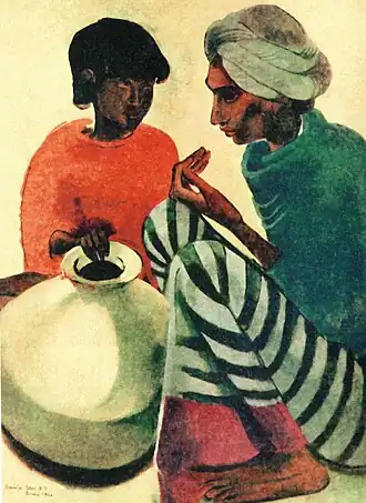 In 1938 five of Sher-Gil's paintings were exhibited at the All India Fine Arts and Crafts Society's exhibition in Delhi, and included Elephants Bathing in a Green Pool (1938), Composition (1936), and View from Studio (1934), which won the prize.[20] In the same year she married Viktor Egan in Hungary, and there painted Two Girls among others.[21] Returning to India in 1939, she moved to Saraya, Uttar Pradesh, and there her creations included Woman on Charpoy, Elephant Promenade, The Ancient Story Teller, and Haldi Grinders.[21][22] The dome of the family's estate features in the background of some of these, though she omits the Saraya Sugar Mills and its chimneys and smoke.[23]