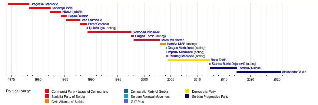 | 7 | Slobodan Milošević (1941–2006) ![]() [a] | 8 May 1989 | 11 January 1991 | 1 year, 248 days | SKS SPS | |