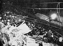 1962 Mikawashima train crash in Arakawa, Tokyo May 3 – Japan – Mikawashima train crash: A freight train passed a danger signal and was diverted safely into a siding at Mikawashima Station in Tokyo, but derailed at the end of it, fouling the adjacent track. A 6-car commuter train bound for Toride then crashed into the wreckage, and another train bound for Ueno crashed into the new wreckage as well as passengers trying to evacuate from the previous crash. Altogether 160 people were killed and 296 injured.[33][37]