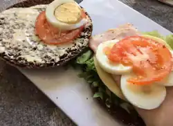 • A sandwich that contains eggs as the main component, usually sliced or chopped hard boiled eggs or egg salad. It can be mixed with mayonnaise, and seasoned with salt and black pepper; or with a mild curry powder in an Australian curried egg sandwich.[15][16] Other versions may be made with fried or (more rarely) scrambled egg, topped with the local roe spread, locally called kaviar.