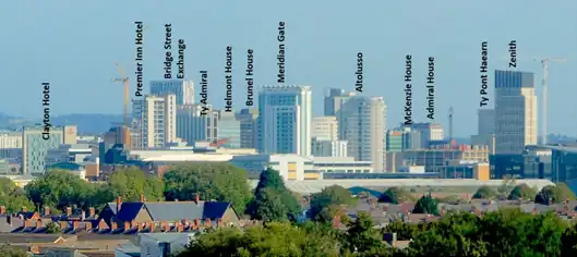 The city's growth is reflected in its growing skyline.[1] As is the case with many British cities, some of Cardiff's skyline comprises 1960s and 1970s residential and commercial tower blocks. However, current development trends for high-rise buildings include upmarket apartments and office space.