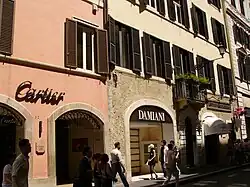 Rome's leading shopping street, it contains a wide category of high-fashion or haute-couture boutiques and salons, such as Valentino, Bulgari, Gucci, Dolce & Gabbana, Louis Vuitton, Chanel, Giorgio Armani, Prada and Dior, the headquarters, ateliers or major offices of major flagship labels such as, and also several of the city's finest restaurants, cafes, antique shops and bars. |
