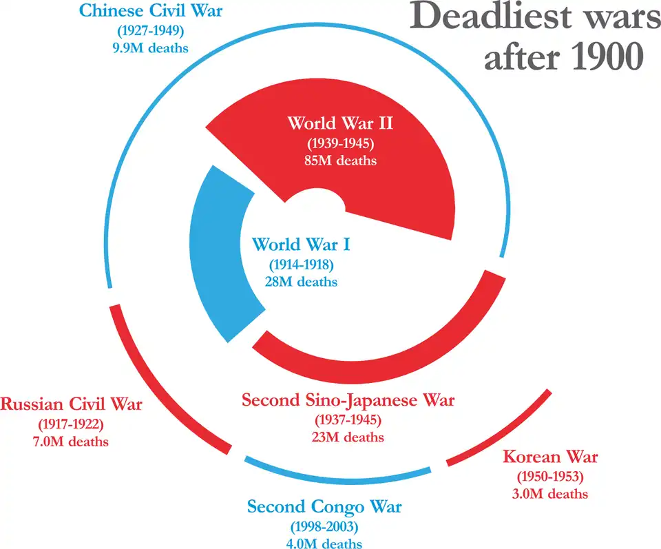 | World War I | 15–22 million[15][16][3] | 1914–1918 | Allied Powers vs. Central Powers | Global | 0.85%–1.25%[1] |