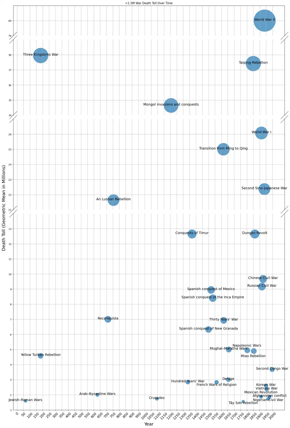 This list of wars by death toll includes all deaths directly or indirectly caused by the deadliest wars in history. These numbers encompass the deaths of military personnel resulting directly from battles or other wartime actions, as well as wartime or war-related civilian deaths, often caused by war-induced epidemics, famines, or genocides. Due to incomplete records, the destruction of evidence, differing counting methods, and various other factors, the death tolls of wars are often uncertain and highly debated. For this reason, the death tolls in this article typically provide a range of estimates.