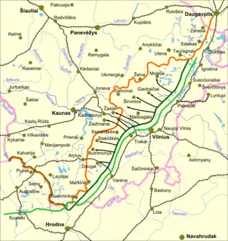 Red Army captured one town after another: Zarasai and Švenčionys (Dec. 22), Utena (Dec. 23), Rokiškis and Vilnius[33] (Jan. 5), Ukmergė and Panevėžys (Jan. 9), Šiauliai (Jan. 15), and Telšiai (Jan. 25).[30] That accounted for about 2⁄3 of the Lithuanian territory. The front somewhat stabilized when Soviet forces were stopped near the Venta River by Latvian and German units (Baltische Landeswehr).[34] Also, Germans slowed down the withdrawal of their troops after the Spartacist uprising was subdued on January 12.[35] Southern Lithuania was a little better protected as Germans retreated from Ukraine through Gardinas. To prevent fights between retreating Germans and the Red Army, the Soviets and Germans signed a treaty on January 18. The treaty drew a temporary demarcation line that went through Daugai, Stakliškės, and 10 kilometres (6.2 mi) east of the Kaišiadorys–Jonava–Kėdainiai railway.[36] That barred Bolshevik forces from directly attacking Kaunas, Lithuania's second-largest city. The Red Army would need to encircle Kaunas and attack through Alytus or Kėdainiai. The operation to take Kaunas began on February 7.