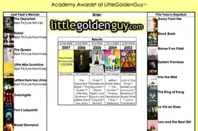 Little Golden Guy is a website which presents statistical data related to the Academy Awards (also known as the Oscars). Launched by Brian Barney in 1999,[1] the search engine provides a method of tabulating the films and individuals holding records for the most nominations and awards within a particular category or within a specified timeframe.[2] The website maintains data from the 1st Academy Awards ceremony, honoring films from 1927 and 1928, to the 84th Academy Awards ceremony, honoring films from 2011.[3] The site's search results also provide internal links to annual summaries, as well as statistical breakdowns of individual awards categories. The site has not been updated since the 2013 Academy Awards.[4]