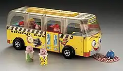 Another early Little People precursor, the #959 "Safety School Bus", was introduced in 1959.[1][7] The set included a school bus together with six independent figures made out of tall slimmer pegs of cardboard tubes wrapped in lithographs simulating clothes. The toy gained instant popularity and other sets soon came out.