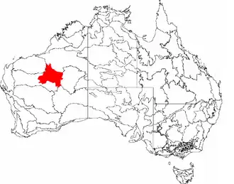 The Little Sandy Desert covers around 110,900 km2 (42,800 sq mi) and adjoins the Great Sandy Desert (267,250 km2 (103,190 sq mi), to the north) and the Gibson Desert (156,300 km2 (60,300 sq mi), to the east), all of which lie within the huge Australian Arid Zone which covers the centre of the Australian continent.[5] It lies east of the Pilbara region,[3] and north of Gascoyne,[6] and is part of the Western Desert.[7]