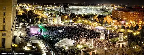 Live On The Green (LOTG) is a free outdoor music festival in Nashville, Tennessee produced and presented by local radio station WRLT Lightning 100 that showcases the city's emerging musical talent and highlights well-known national acts. Since its first year in 2009, it has been held at Public Square Park in downtown Nashville adjacent to the historic Metropolitan Courthouse and attracts over 600,000 fans from all 50 states and 15 countries.[1] It has been held every year except 2020 and 2021 when it was cancelled during the COVID-19 pandemic, in which the radio station instead hosted live performances and interviews with the artists.[2] The festival hosts two stages showcasing the city's emerging musical talent and highlights well-known national acts, and also includes food trucks, vendors, and a VIP experience.