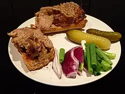 A popular everyday version is to spread cold leverpostej on a slice of rugbrød (Danish dark wholemeal rye bread) and eat it as a simple open-faced sandwich. More extravagant variations include the smørrebrød known as Dyrlægens natmad.[4] Swedes often use it on crispbread. It may be topped with a variety of accompaniments, such as pickled beets or cucumbers, raw onions, fried onions, fried bacon or slices of fresh cucumber.