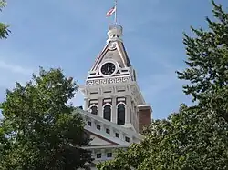 The current Livingston County Courthouse is the third building to carry that name. Construction on the present-day courthouse began in late 1874 and was completed late the next year. The courthouse was built after fire consumed the second Livingston County Courthouse on July 4, 1874. The plan for the courthouse was selected from a slate of ten candidate plans.[2] The County Board of Supervisors noted at the time that the selected plan "cost more money (but) it was the only one which for size, fire-proof qualities, and solidity would answer the purpose, and was indeed, in the matter of taste and elegance, much in advance of any other."[2] However, the author of the 1915 The County Archives of the State of Illinois called the building "hardly fireproof".[3] The courthouse clock tower was installed in 1892.[2] The Courthouse served as the county's primary judicial center until 2011, when the Law and Justice Center opened across the street. The historic Courthouse currently houses county offices that are not court-related.[4]