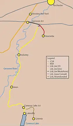The LAL has trackage rights at CSX's Genesee Junction Yard, allowing the LAL to interchange with the Rochester and Southern Railroad as well as CSX. LAL ownership begins at the east end of Genesee Junction with the former Conrail non-controlled siding that runs parallel to the West Shore Branch from Genesee Junction Yard to MP 360. There, the line heads south onto what was once Erie-Lackawanna Railroad and Lehigh Valley Railroad trackage. Shortly after crossing Jefferson Road (NY-252), the track splits, with one track, the ex-LV Rochester Branch, heading southeast to a pair of online businesses on Lehigh Station Road (NY-253) before coming to an end, while the other track, ex-EL trackage, continues south/southwest towards Avon and eventually hits the Lakeville terminus, ending just shy of Conesus Lake, at one time a Steam Boat terminal.