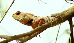 Most social interactions among lizards are between breeding individuals.[28] Territoriality is common and is correlated with species that use sit-and-wait hunting strategies. Males establish and maintain territories that contain resources that attract females and which they defend from other males. Important resources include basking, feeding, and nesting sites as well as refuges from predators. The habitat of a species affects the structure of territories, for example, rock lizards have territories atop rocky outcrops.[32] Some species may aggregate in groups, enhancing vigilance and lessening the risk of predation for individuals, particularly for juveniles.[33] Agonistic behaviour typically occurs between sexually mature males over territory or mates and may involve displays, posturing, chasing, grappling and biting.[32]