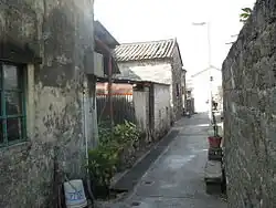 Inside Lo Wai. The white building in the background is the entrance tower of the village.