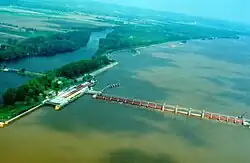 Lock and Dam No. 25 is a lock and dam located near Winfield, Missouri, on the Upper Mississippi River around river mile 241.4. The movable portion of the dam is 1,296 feet (395.0 m) long and consists of three roller gates and 14 tainter gates. A 2,566 feet (782.1 m) submersible dike extends to the Illinois shore. A 5 miles (8.0 km) long dike is part of the facility extending upstream on the Missouri side of the river. The main lock is 110 feet (33.5 m) wide by 600 feet (182.9 m) long.[2] In 2004, the facility was listed in the National Register of Historic Places as Lock and Dam No. 25 Historic District, #04000184 covering 3,164 acres (12.8 km2), 2 buildings, 7 structures, 2 objects.