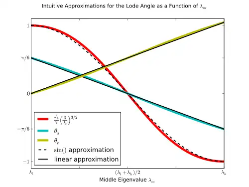 The Lode angle can be considered, rather loosely, a measure of loading type. The Lode angle varies with respect to the middle eigenvalue of the stress. There are many definitions of Lode angle that each utilize different trigonometric functions: the positive sine,[5] negative sine,[6] and positive cosine[7] (here denoted , , and , respectively)