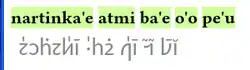 The .y'ybu and denpabu are written with the same symbols as the Latin script. The pattern of .X'Y, where X and Y are vowels, can be written with the two symbols merged, allowing attitudinals to be written more naturally.