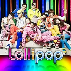 "Lollipop" is a song by South Korean groups Big Bang and 2NE1, released under YG Entertainment on March 27, 2009. Created to promote a cellphone by LG Cyon,[1] it interpolates the 1958 hit "Lollipop" written by Julius Dixson and Beverly Ross. The song achieved the top spot on various online charts, including a four week run at number one on music portal Mnet.[2] "Lollipop" was used to debut 2NE1 unofficially, as it does not serve as their debut single.[3] 2NE1 followed up with their official debut single "Fire".[4]