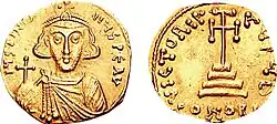 Beginning with the rise of Romuald II a third type was introduced, with the bust of the emperor holding the globus cruciger on the obverse.[19] This type imitated coins issued under the early reign of Justinian II[20] and was used in the coinage of Benevento until the middle of the reign of Godescalc (c. 740).[9] The inscriptions used were those of Justinian's coins. According to Grierson and Blackburn the type was probably chosen because of the familiarity of the Benevento Lombards with this type, which was used by many emperors during the 7th century.[9]