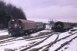 Encouraged by the performance of the vehicles, the District Railway purchased two of their own in 1909, which were larger as they were built to subsurface-gauge. The manufacturer was W. R. Renshaw and Co Ltd, who were based in Stoke-on-Trent in Staffordshire, and the vehicles were fitted with current collector shoes, so that they could draw power from the rails when it was available.[2] During the First World War, they were used as shunting engines at Ealing Common Depot, where power was always available, and so the batteries were removed, and subsequently neglected. New batteries could not be obtained, as batteries of this type were needed for submarines as part of the war effort. The vehicles were numbered 19A and 20A when supplied, but were renumbered as L8 and L9 in 1929, when the batteries were no longer fitted. As electric locomotives, they were upgraded several times, receiving two new types of motors in 1951 and 1955, and new traction control equipment in 1958. They continued to be used to move stores between Acton Works and Ealing Common Depot, until they were superseded by road vehicles in 1969.[3]
