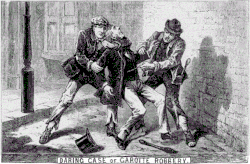 Although difficult to measure at a time when most crime went unrecorded it is thought that crime in London had generally been reducing since the 1829 establishment of the Metropolitan Police.[2] Despite this, in 1856 the British public regarded the streets of London as dangerous. A November speech by the Prime Minister Lord Palmerston announcing that Britons would feel safe to travel the world led to an editorial in the Times that stated "it is of far more moment to a Londoner that he should be able at all hours of the day or night to walk safely in the streets of London". The editor claimed that areas of the city were no-go areas for respectable people who were at "imminent danger of being throttled, robbed, and if not actually murdered, at least kicked and pommelled within an inch of his life".[4] Subsequent reports in the press claimed that garrotting was on the rise and led to a panic among the middle classes.[1]