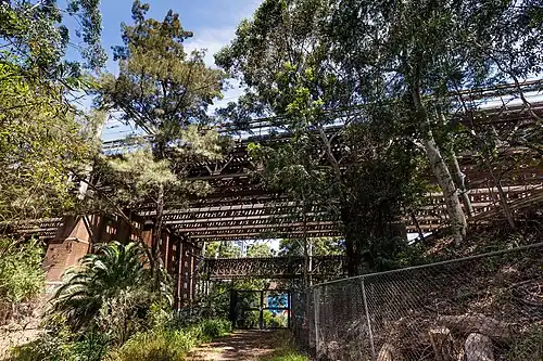 The largest structure on the line was the 8-span stone arch viaduct over Long Cove Creek on the western side of Petersham. By the 1880s deterioration lead to its replacement by three pairs of 27-metre (90 ft) Whipple trusses, they were American type wrought iron, pin-jointed deck trusses. The bridge was only one of two bridges in NSW to employ the Whipple Truss (the other being a road bridge over the Shoalhaven River at Nowra). These were subsequently replaced by welded, deck plate web girders in 1993. A pair of the Whipple trusses are on display on the southern side of the Lewisham Viaduct.[1]