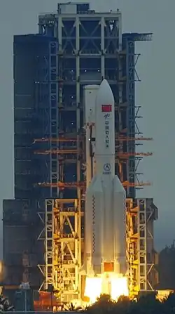 Long March 5 (LM-5; Chinese: 长征五号; pinyin: Chángzhēng wǔ hào) or Changzheng 5 (CZ-5), also known by its nickname "Pang-Wu" (胖五, "Fat-Five"),[8] is a Chinese heavy-lift launch vehicle developed by the China Academy of Launch Vehicle Technology (CALT). It is the first Chinese launch vehicle designed to use exclusively non-hypergolic liquid propellants.[9] It is the fifth iteration of the Long March rocket family.