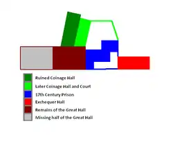 This building was part of a very large complex, covering more than 2 acres (8,100 m2), built by Edmund, 2nd Earl of Cornwall in around 1280 during the reign of King Edward I.[1] In the 14th century, the complex, which included a great hall, an exchequer hall, a coinage hall and a smelting house, was used by the Edward the Black Prince, then the Duke of Cornwall, as his exchequer headquarters.[2] When the Black Prince paid his first visit to Lostwithiel and Restormel Castle in 1353, he installed the Prince of Wales' plume of feathers on the apex of the exchequer hall roof where they remain.[1]