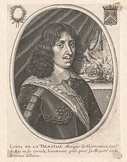 Louis II de La Trémoille (25 December 1612 – 12 October 1666), Marquess, then Duke of Noirmoutier, was a French aristocrat often simply referred to as "Noirmoutier". A General and Maréchal de camp who fought at the Battle of Lens and in The Fronde, following which he served as Governor of Mount Olympus in Charleville-Mézières.