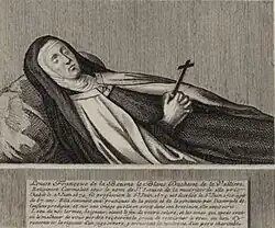 During Lent 1662, a guest preacher, Jacques-Bénigne Bossuet delivered a series of sermons criticising the King's behaviour through biblical examples.[59] In late February, Louis questioned La Vallière about an alleged affair between Madame and the Count of Guiche, but she refused to answer.[2][57][60] After their argument, troubled by Bossuet's sermons,[61] she fled the Tuileries for the Augustinian Convent of Sainte-Pélerine in Chaillot.[57][62] The King was informed during an audience with Spanish envoys, rushed to end the talks, and searched for her personally amid fears that his wife would learn of his affair because of La Vallière's disappearance.[57][63] La Fayette claims that Madame and Monsieur were reluctant to admit La Vallière back into their household, but she was permitted to stay.[64] The King's affair became public when he did not take communion on Easter. His failure to participate in the Eucharist had already been noted, but when he did not receive the sacrament on Easter (which all Catholics were commanded to do), it caused a ‘scandal’. Since people who were ‘living in sin’, such as committing adultery, could not receive the Eucharist, courtiers became aware that Louis was conducting a sexual affair.[65]
