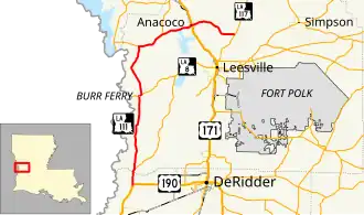 From the south, LA 111 begins at a junction with US 190 in Junction, a small community located in the northwest corner of Beauregard Parish. US 190 connects with Merryville to the south and DeRidder to the east. LA 111 heads north and crosses a bridge over Bayou Anacoco, simultaneously entering Vernon Parish.[2][3][4] Shortly afterward, LA 464 begins, splitting off to the northeast. Over the next 13 miles (21 km), LA 111 continues through a sparsely populated pine forest with small clusters of residences visible at points such as Almadane and Evans. It then reaches a T-intersection with LA 8 (Nolan Trace Parkway) at Burr Ferry, located less than two miles (3.2 km) from the Texas state line at the Sabine River.[2][5][6]
