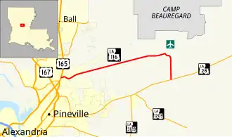 Louisiana Highway 116 (LA 116) is a state highway located in Rapides Parish, Louisiana. It runs 8.39 miles (13.50 km) in an east–west direction from U.S. Highway 165 (US 165) in Pineville to LA 28 at a point east of Pineville.