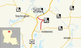 Louisiana Highway 136 (LA 136) is a state highway located in Ouachita Parish, Louisiana that runs 3.50 miles (5.63 km) in a north–south direction from LA 134 at Fairbanks to a junction with U.S. Highway 165 (US 165) and LA 2 at the eastern limit of Sterlington.
