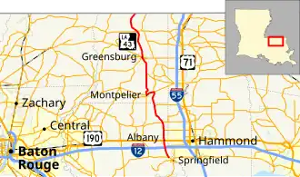 From the south, LA 43 begins at a junction with LA 42 just outside the Livingston Parish town of Springfield. The route heads north through an area known as Hungarian Settlement and passes through an interchange with I-12 at exit 32, connecting with the cities of Hammond and Baton Rouge. Immediately north of I-12 is an intersection with LA 1040 (Old Baton Rouge Highway), an older alignment of US 190. LA 43 enters the village of Albany and becomes known as Montpelier Road. In the center of town, LA 43 intersects US 190 (Florida Boulevard), which serves local traffic along the I-12 corridor. Immediately north of this junction, LA 43 crosses the Canadian National Railway (CN) line at grade.[2][3][4]