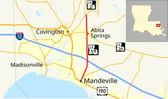 Louisiana Highway 59 (LA 59) is a state highway located in St. Tammany Parish, Louisiana. It runs 11.74 miles (18.89 km) in a north–south direction from U.S. Highway 190 (US 190) in Mandeville to LA 21 north of Abita Springs.