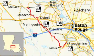 Louisiana Spur Highway 77 (Spur LA 77) is a 1.4-mile-long (2.3 km) highway that covers a glitch in the state highway system. The current LA 77 follows the routing of the original Jefferson Highway, and the LA 77 alignment follows the old road to meet LA 10 West. However, this shortcut is used to reach Morganza, to the northeast of Livonia.[2]